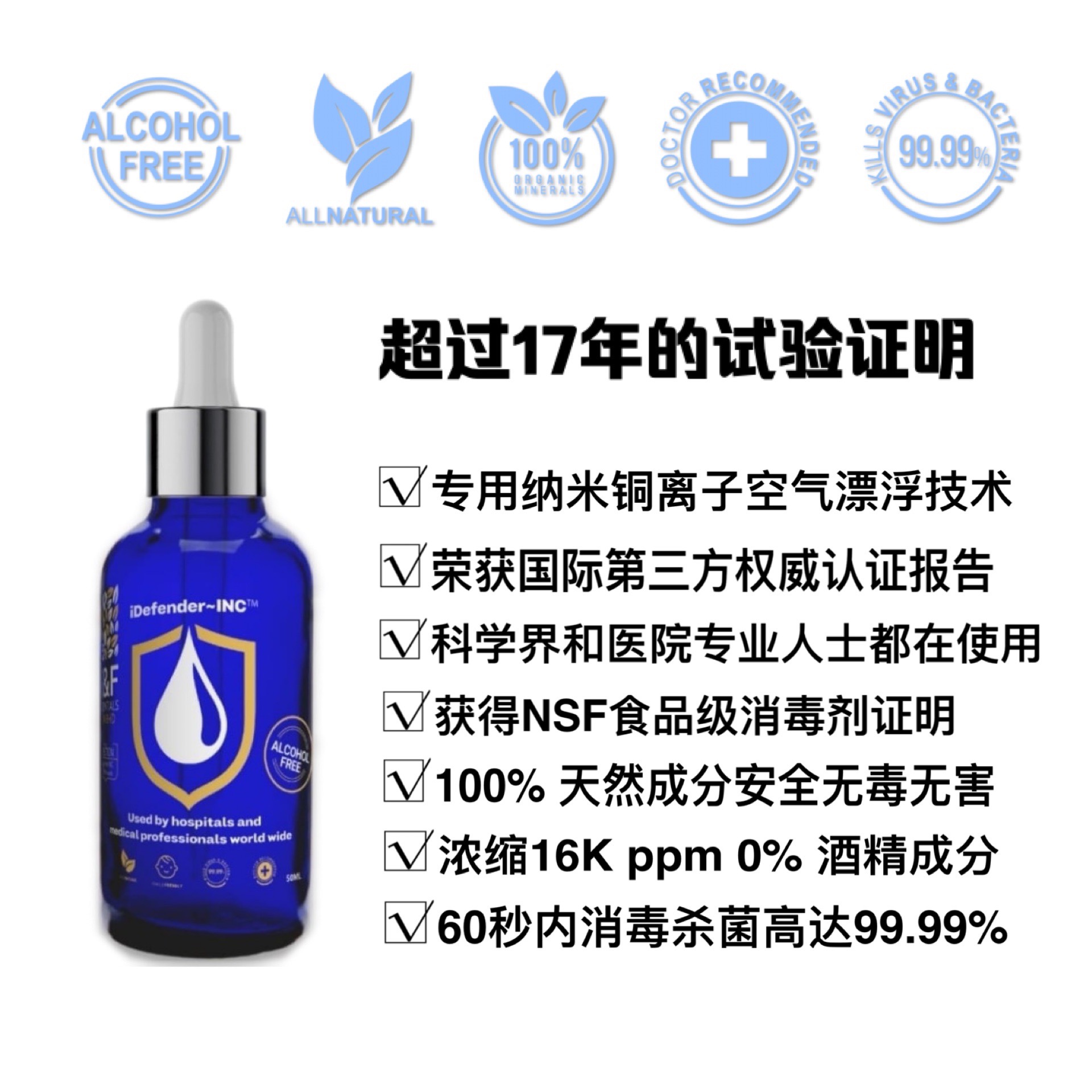口罩和消毒剂已经是现在生活的基本的装备,但是你可想过Delta 病毒强势来袭而我们一直忙碌在外,你最终需要一个强大的防护罩保护你的家人!荣获国际第三方权威认证报告,INC- 16,000 ppm 浓度液体~纳米铜离子喷雾液,iDefender-INC,这种 纳米铜离子喷雾液能在短短 60 秒即可消毒杀菌,包括 H1N1,H2N3,SARS 病毒, MERS 和最新的冠状病毒, 同时净化空气。